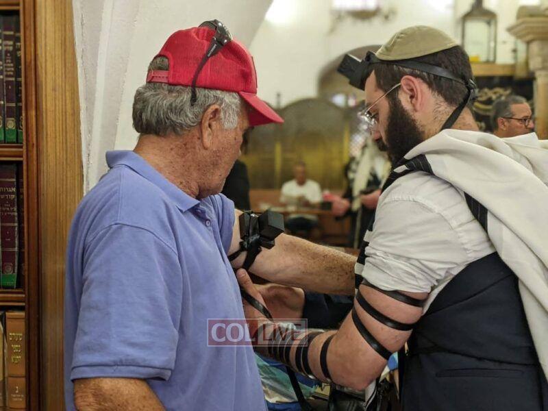 After davening Shacharis at the resting place of the holy Tana, Rabbi Shimon Bar Yochai in Miron, the men sat down to a generous breakfast, and then continued on to Tzfas, where they immersed in the mikva of the Holy Arizal, and davened at the resting place of R’ Yisroel Arye Leib Shneerson OBM.