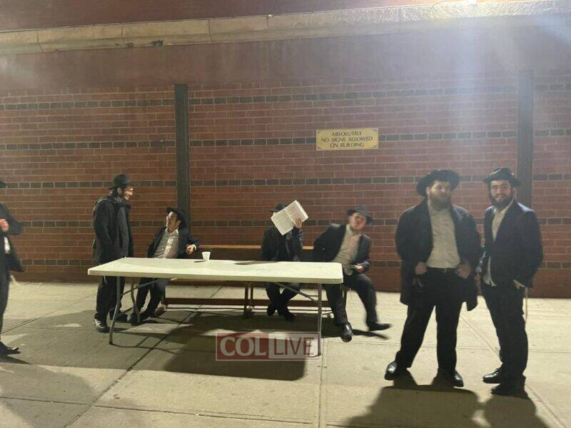 Passersby and residents stop to watch a video of the Rebbe playing during Merkos 302's Mega Zoom farbrengen projected on the side of the Jewish Children's Museum on Kingston Avenue on Motzei Shabbos. More