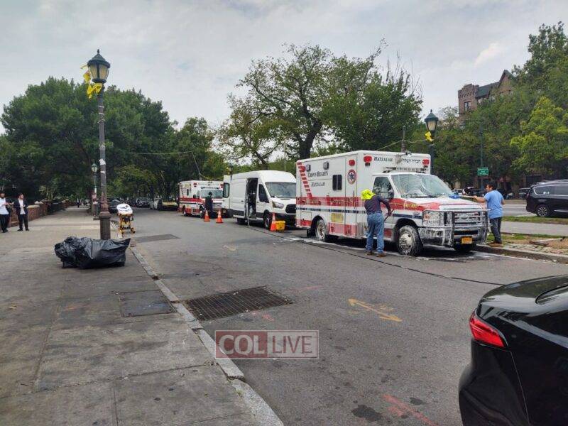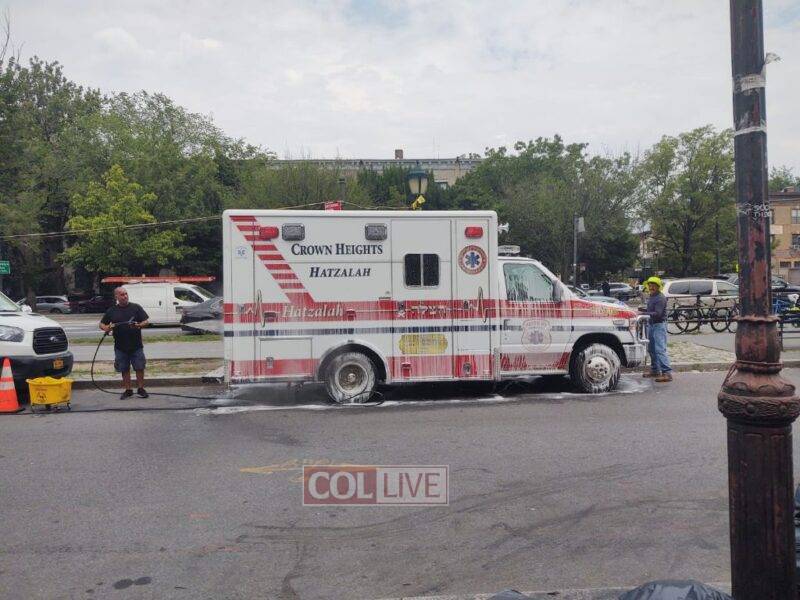 Pre Shabbos rinse: Ambulances of Crown Heights Hatzalah were seen getting a power wash in front of 770 Eastern Parkway on Thursday. Photos