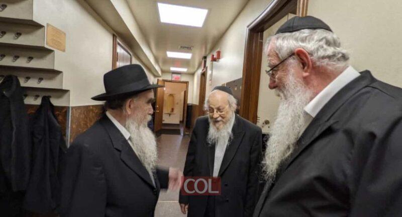 Crown Heights Beis Din member Rabbi Avrohom Osdoba warmly speaks with Shliach Rabbi Avraham Shemtov, Chairman of Agudas Chassidei Chabad International at 770 Eastern Parkway. Rabbi Chaim Boruch Halberstam of WLCC looks on. More