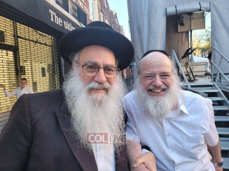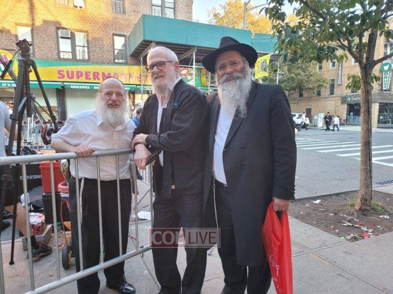 Popular children's entertainer Uncle Moishy was greeted by Crown Heights residents Rabbi Kalman Weinfeld and Yingy Bistritzky as he prepared for his Simchas Beis Hashoeva show on Sunday. More