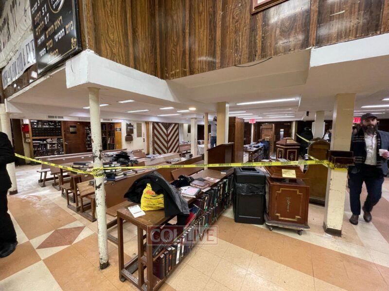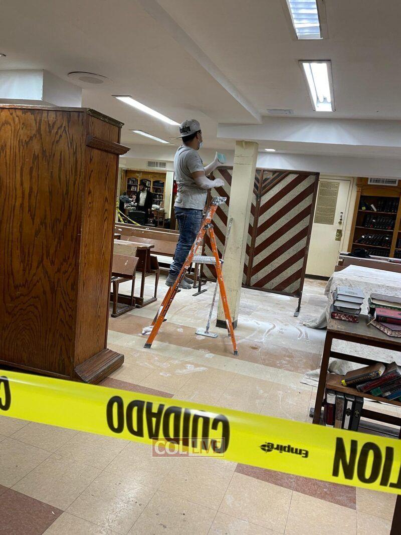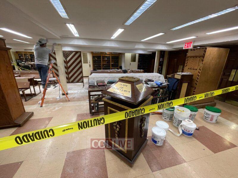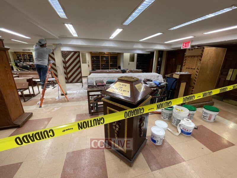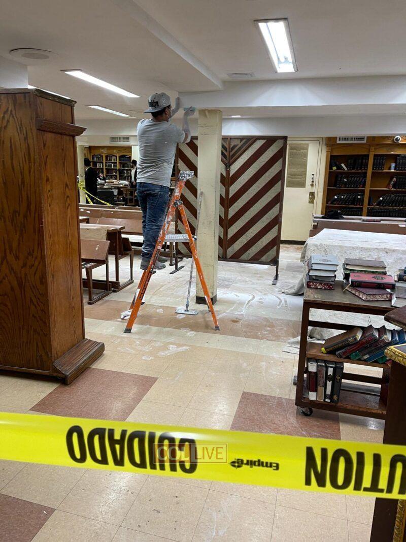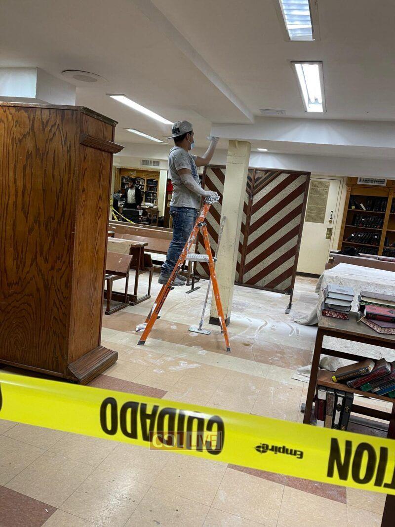 Workers were seen painting and doing repairs in the main Shul of 770 Eastern Parkway on Tuesday. Photos
