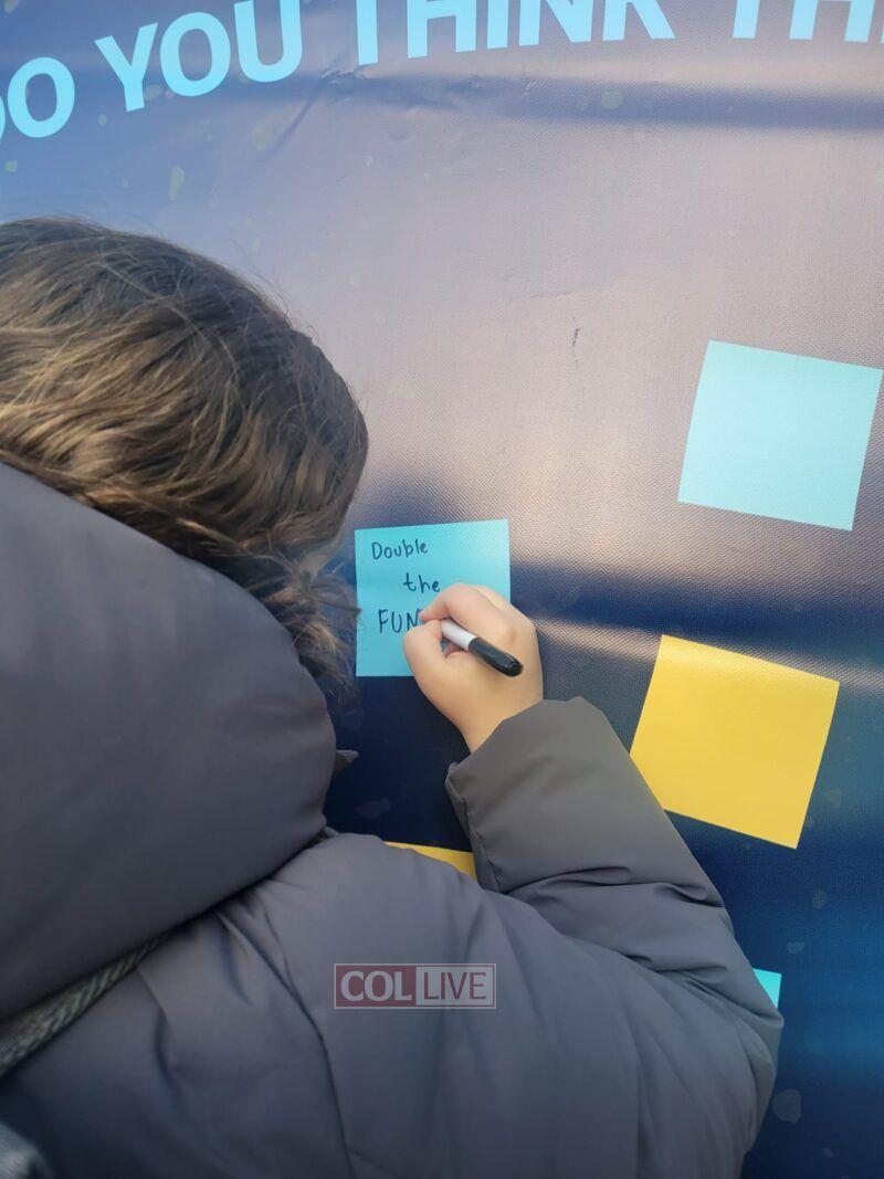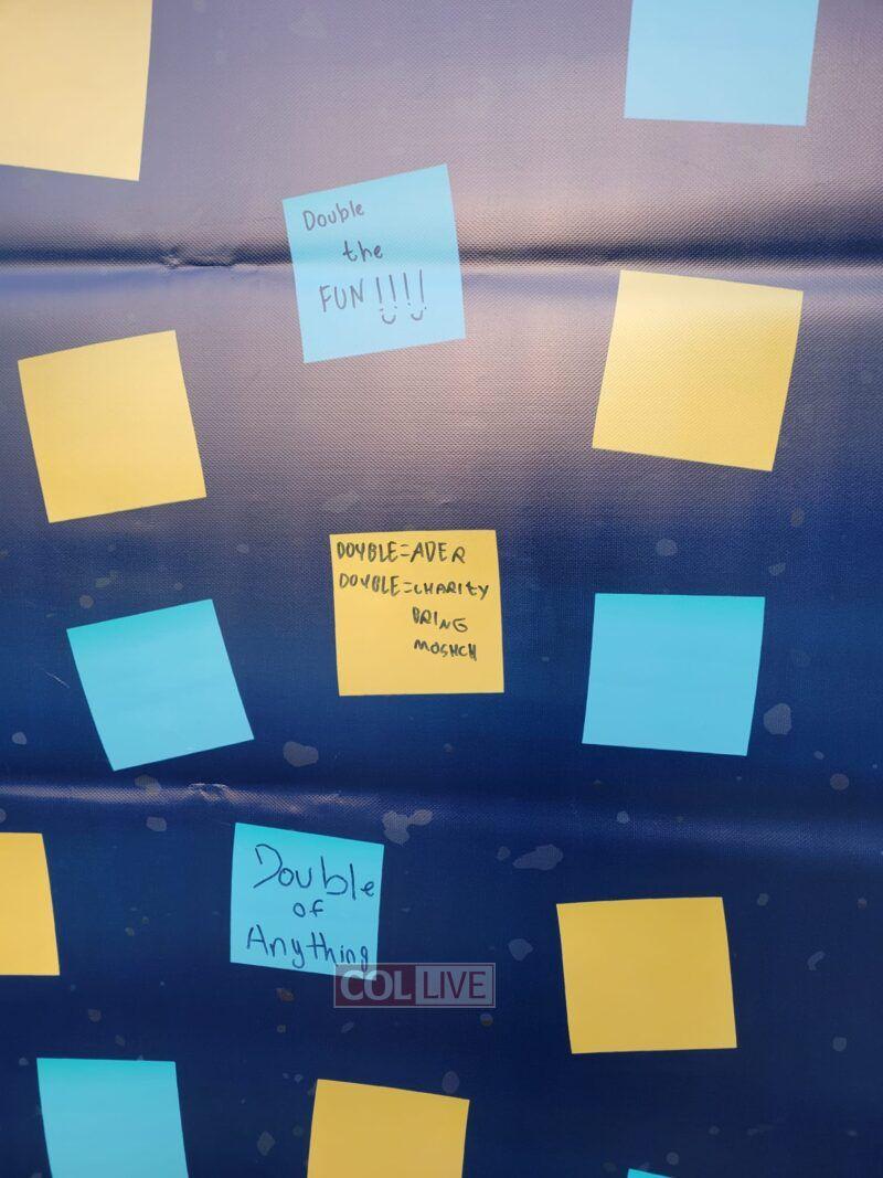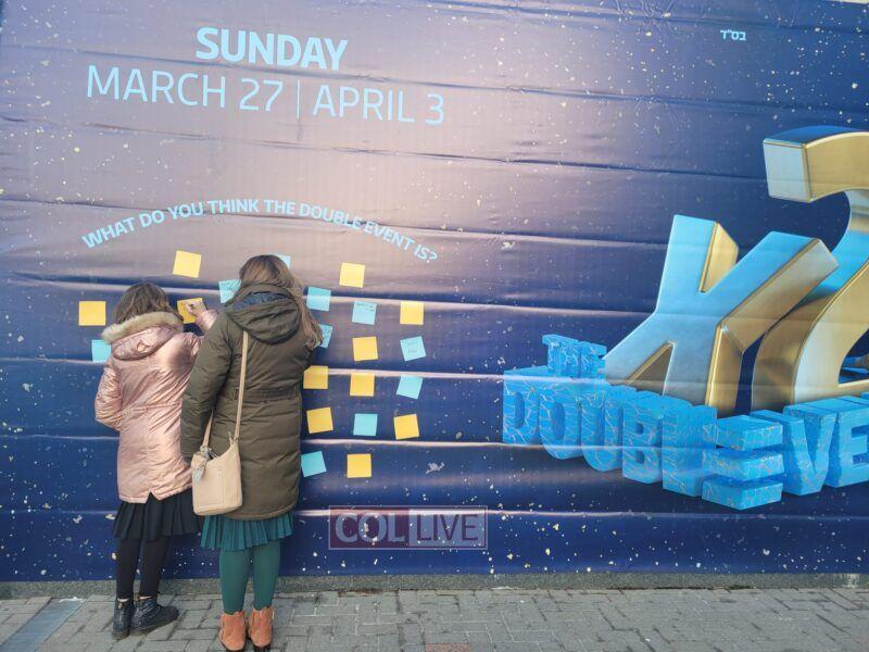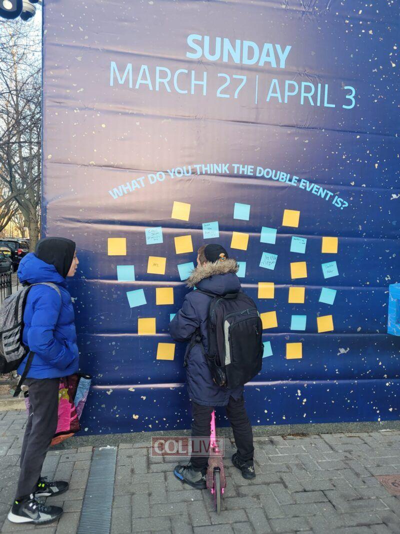 Passersby near the Jewish Children's Museum in Crown Heights leave notes guessing what they think the "Double Event" will be. More