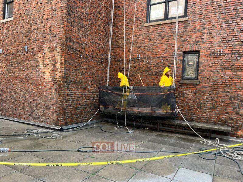 A crew was seen cleaning the red brick walls of the Central Library at 770 Eastern Parkway in Crown Heights on Thursday. More