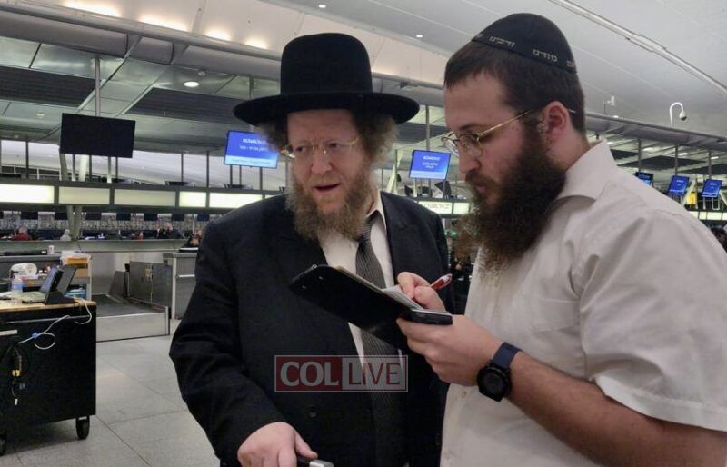 Rabbi Sholom Ber Sorotzkin, Rosh Yeshiva of the Ateres Shlomo kollel and yeshiva network, signs up his grandchild for a letter in the Children’s Sefer Torah at Chabad at JFK airport in New York. More