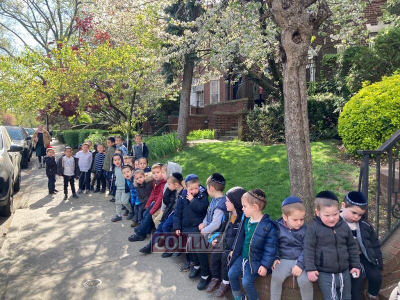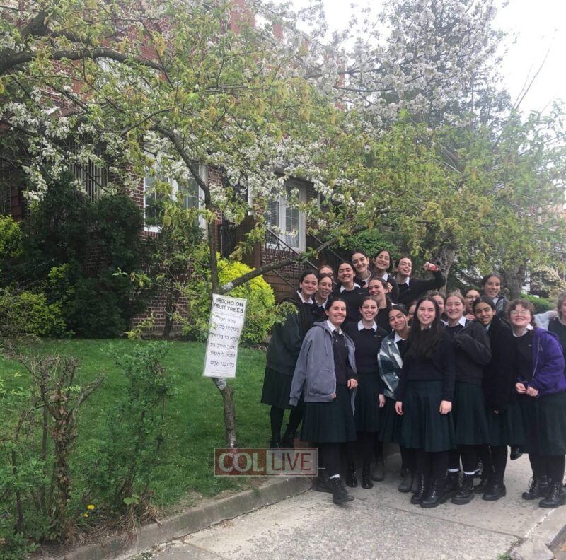 Classes from Crown Heights schools have been stopping by the 2 fruit trees in front of 382 Crown Street between Brooklyn and New York Avenues to recite the birchas hailanos - the once-a-year blessing on the trees, which can be said until tomorrow. More