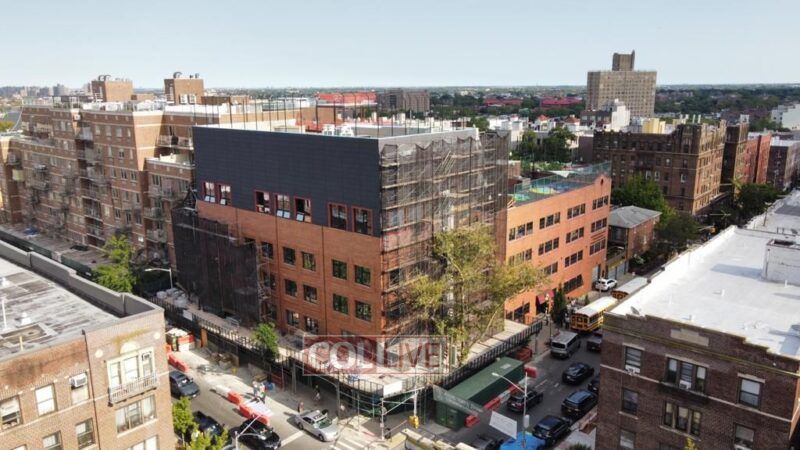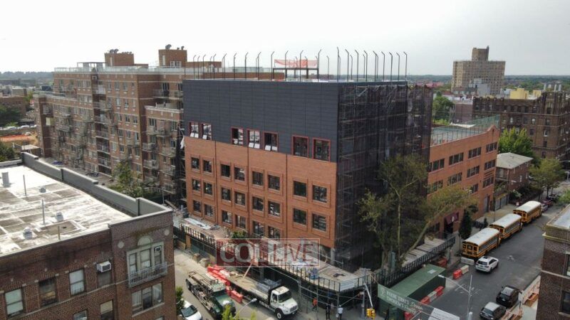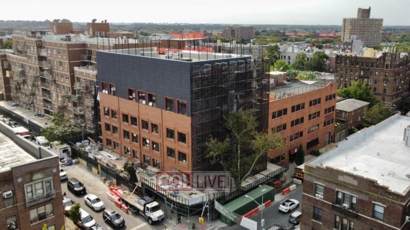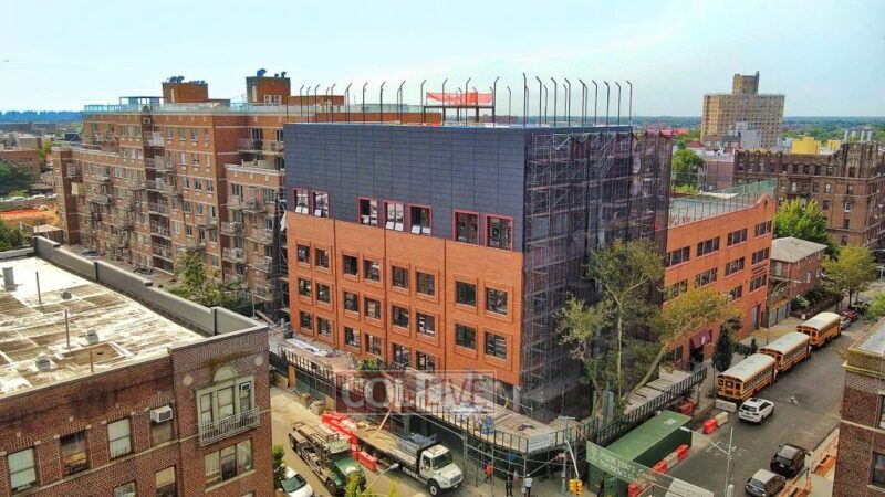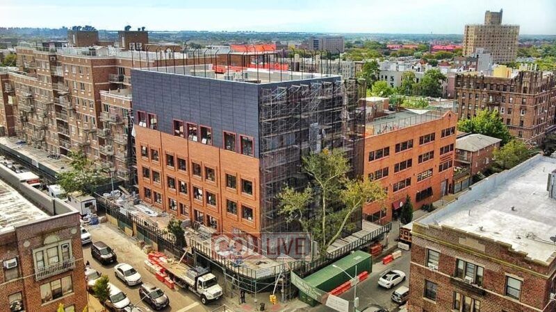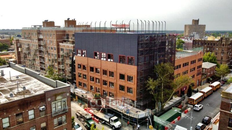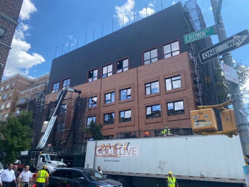 The facade of the new extension of Lubavitch Yeshiva of Crown Heights at 570 Crown Street is going up this week. The expansion of the existing building will create additional classrooms, offices, and play spaces. Photos
