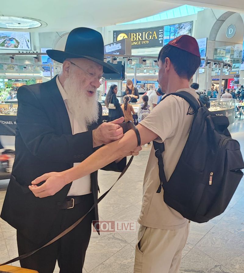 Rabbi Shalom Ber Schapiro, host of the Historic Treasures Shiur on COLlive, filled his time while traveling at Ben Gurion Airport with Mivtza tefillin. More
