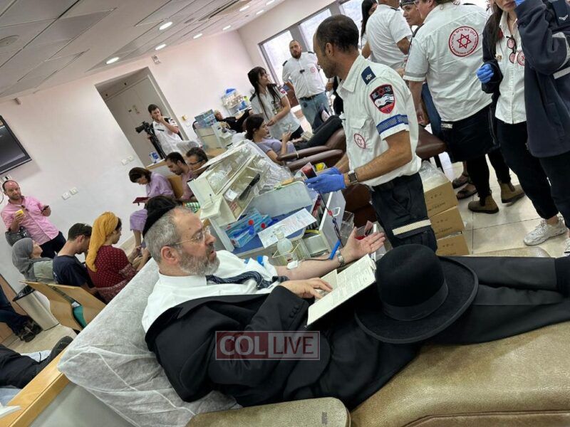 Israel's Chief Rabbi David Lau donates blood at Magen David Adom in Jerusalem on Sunday. Responding to a severe shortage, he called on the public to donate blood for the thousands of injured who urgently need it at this time. Photo