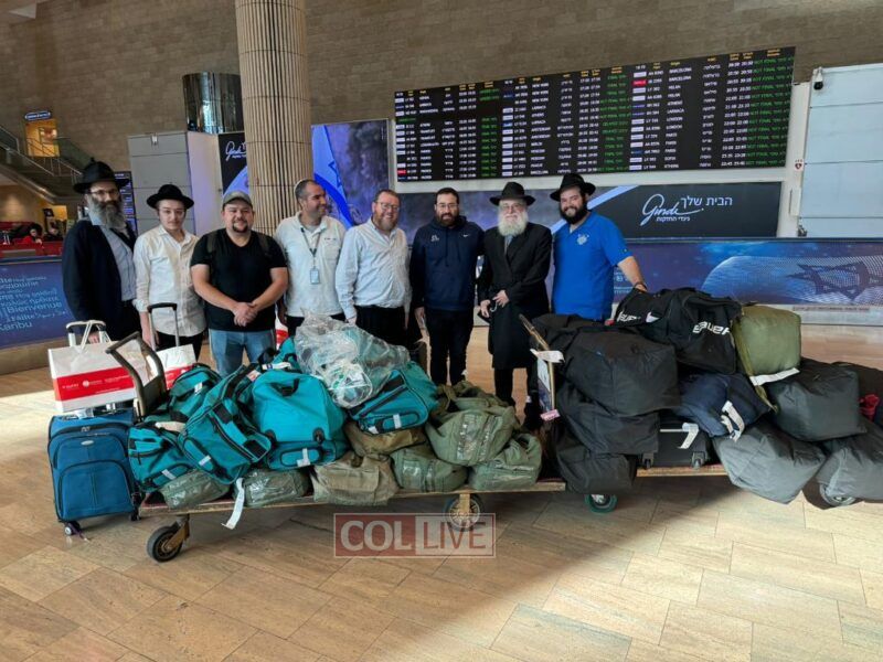 Thanks to a grant from Machne Israel, Shluchim and volunteers deliver protective gear to Rabbi Mendel Lieberman, Director of Chabad Ashkelon, for distribution to those serving the communities and soldiers on the frontlines. Photo