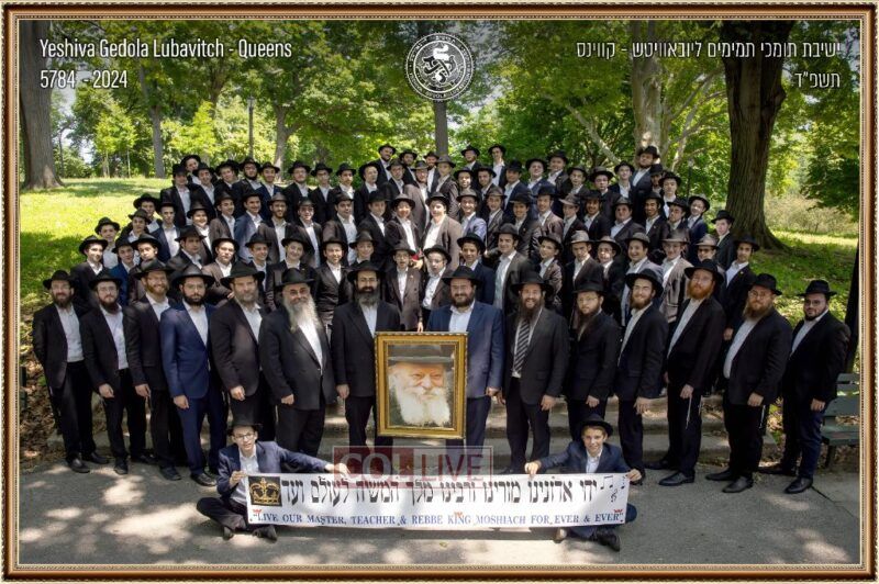 As the Zman draws to an end, Yeshivas Tomchei Tmimim Lubavitch Queens (currently located in Brooklyn) posed for a group photo with students and staff. Photo