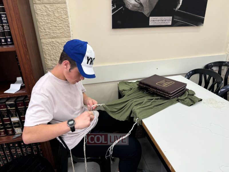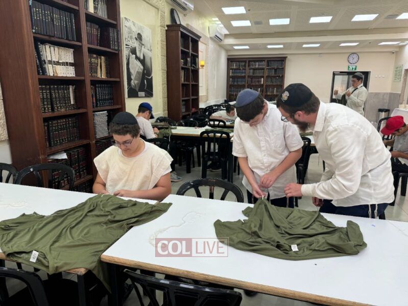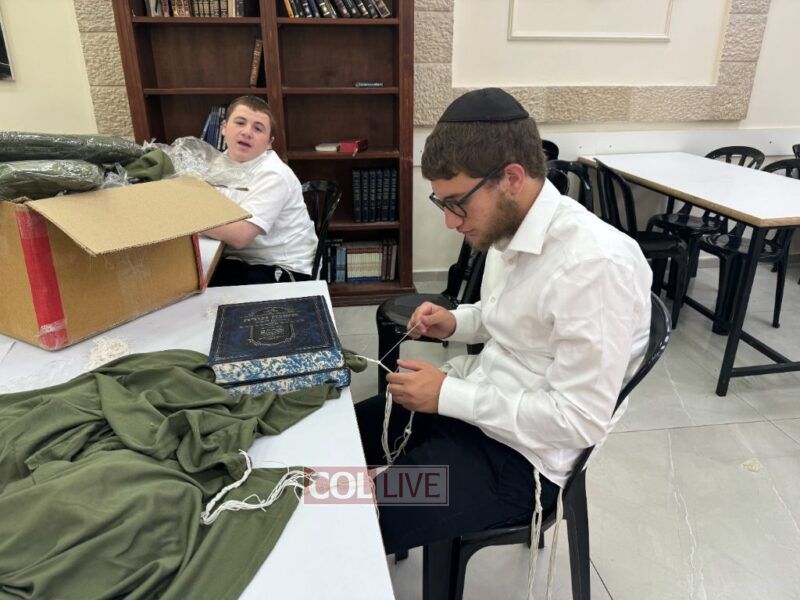 Bochurim in Yeshivas Kayitz Tzeirei Hashluchim Tzfas making Tzitzis for soldiers fighting in the Israel's North. More