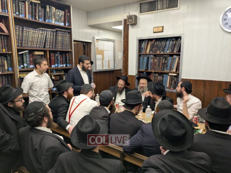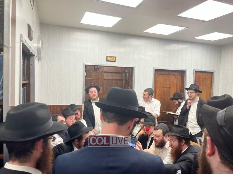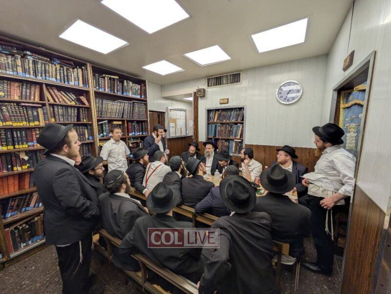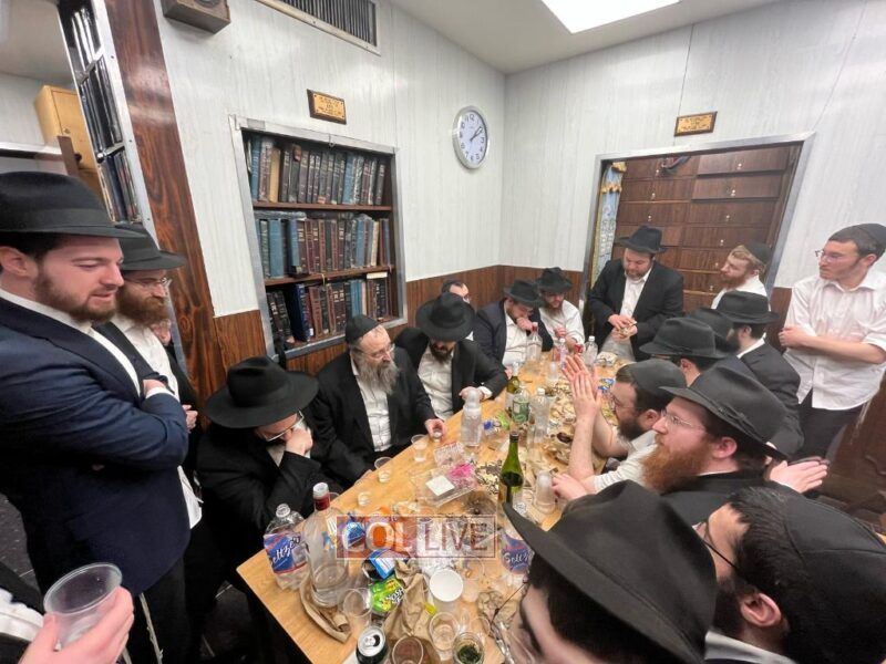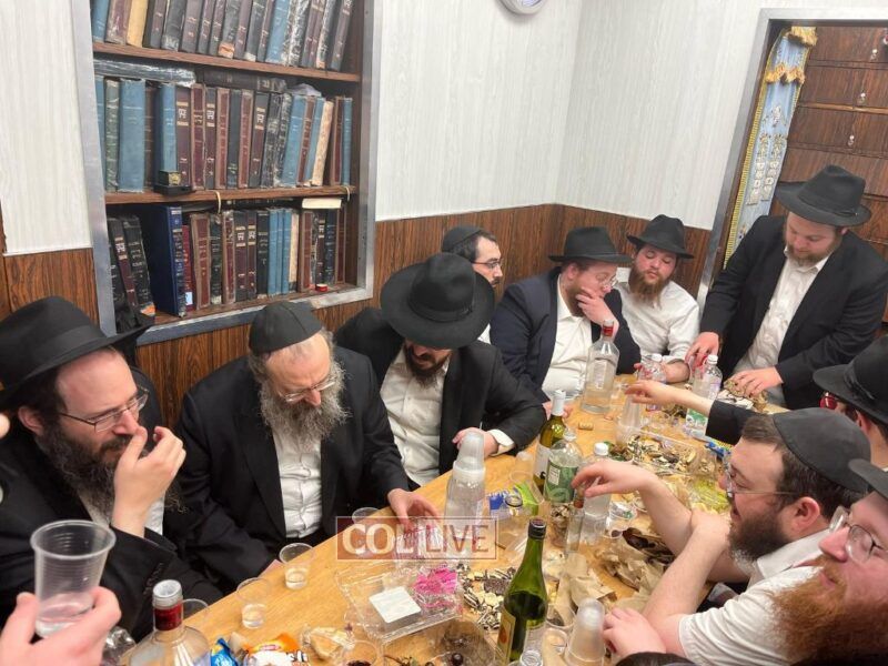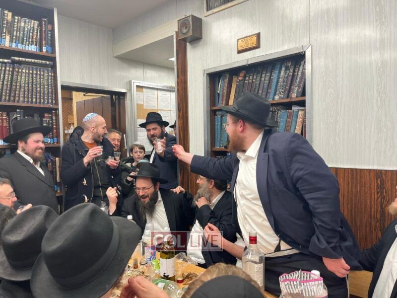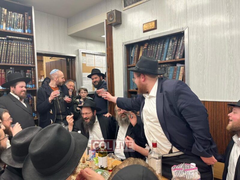 Philanthropist George Rohr and Rabbi Mendy Kotlarsky say l’chaim at a Purim Meshulash farbrengen in the cheder sheini of 770 Eastern Parkway led by Crown Heights Rabbi Yosef Braun and Mashpia Rabbi Shlomo Sternberg. Photos