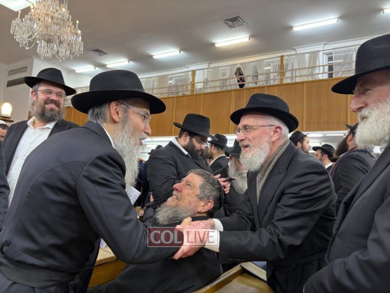 Superstar Chassidic singer R' Avraham Fried, currently doing a series of concerts in Australia, is greeted by Rabbi Yosef Shea Hecht of Melbourne at the Motzei Shabbos Selichos in Yeshiva Center Melbourne, Australia. Photo