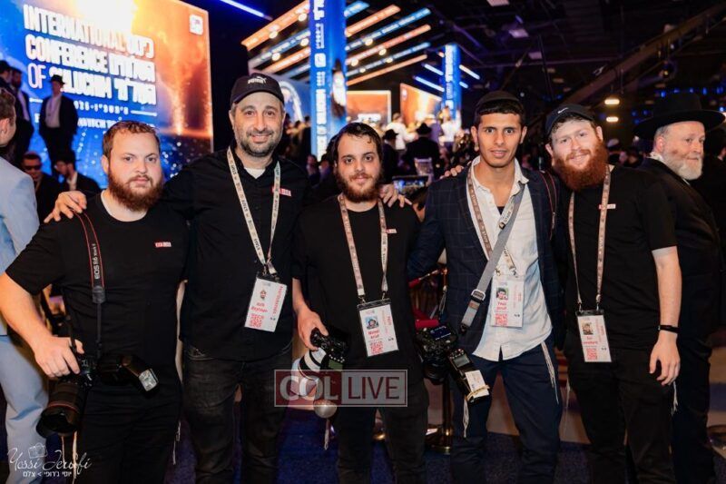 Star team: COLlive.com photographers Shalom Ross, Itzik Roytman, Mendy Krief, Yossi Jerufi and Tzvi Levenhartz pose at the Gala Banquet of the International Kinus Hashluchim in New Jersey after providing extensive coverage of the event. Photo