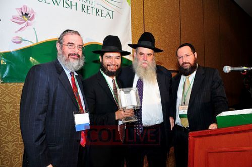 Congregants of the lively 7:30 am Shacharis "Happy Minyan" in 770 were enthused about the return of their founder and coordinator Sholom Backman, back from a three-week stay in Israel. The Chazan, Yossi Katzoff, presented him with a cake. Photo