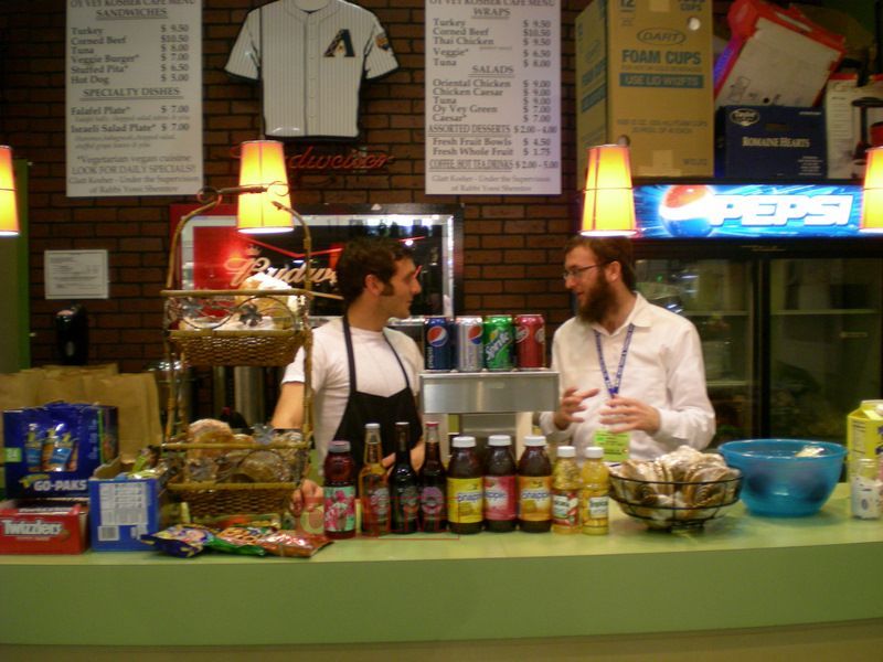 A Lubavitcher does Mivtzoim close to home Friday afternoon - helping a passerby put on tefillin on Kingston Avenue in Crown Heights. Photo