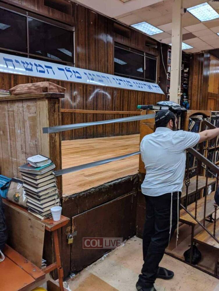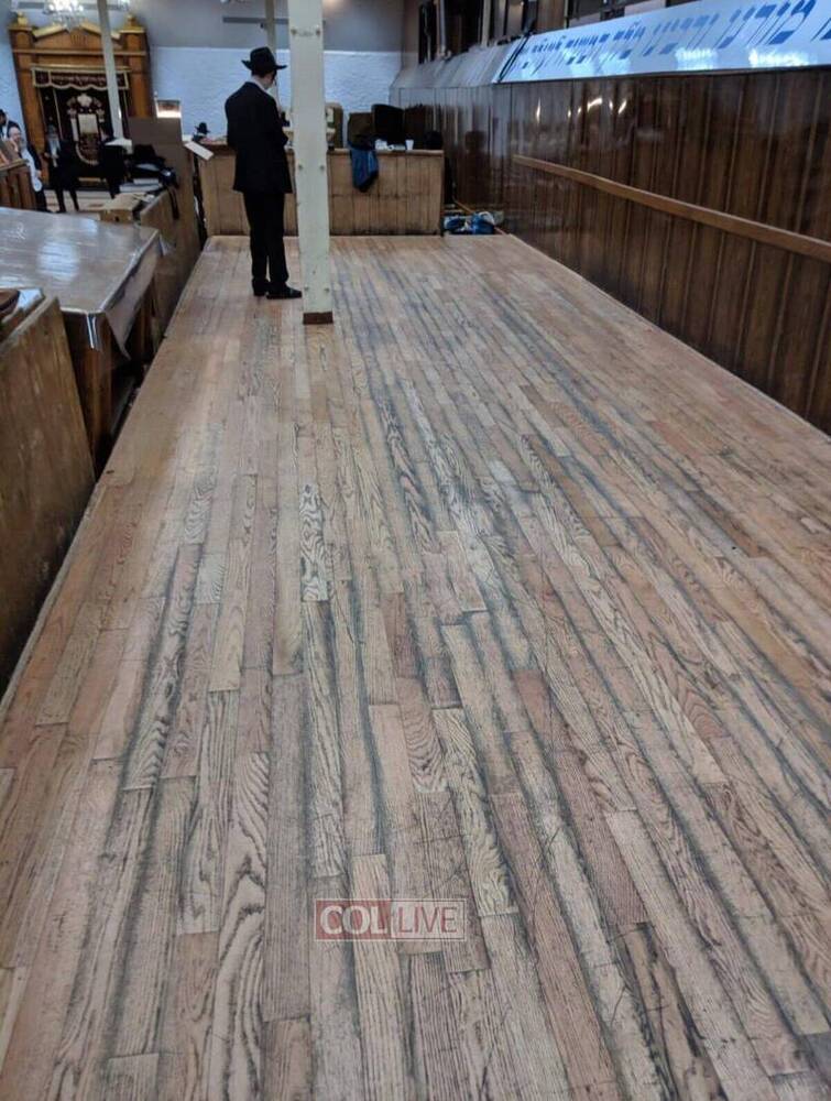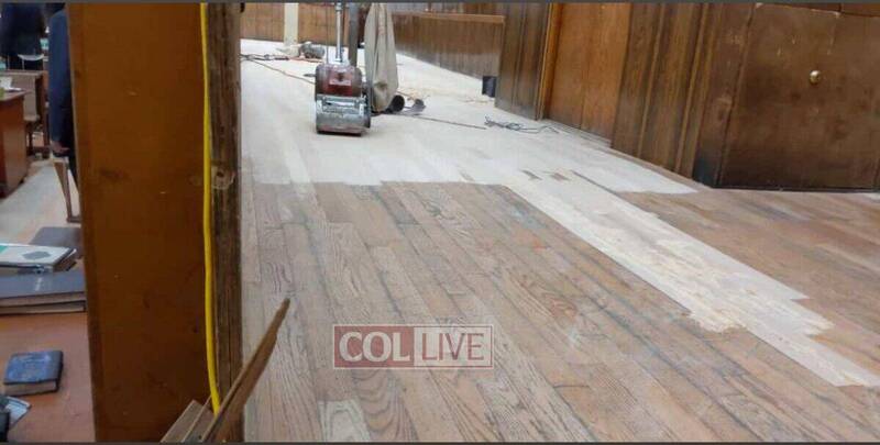 Workers repaired the wooden floor of the Bimah in the main Shul of 770 Eastern Parkway this week. Photos
