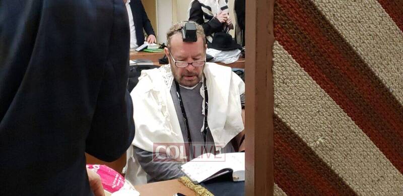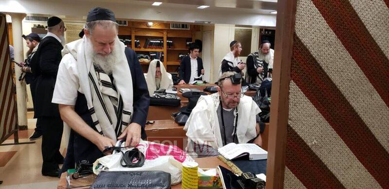 Singing Hashem's praises. International singing star Dudu Fisher joins one of the many morning minyanim for Shachris at the main shul of 770 Eastern Parkway, Monday. More
