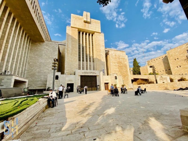 Under the clear sky: A minyan is held on Thursday in the front courtyard of the Great Synagogue of Jerusalem, located at 56 King George Street, in accordance with health regulations. Covid cases have recently risen in Israel. Photo