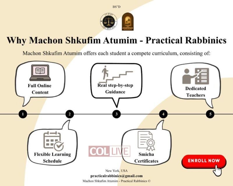 The Practical Rabbinics Apprenticeship Program – Machon Shkufim Atumim led by Dayan Rabbi Mordechai Zev Hecht of the Beis Din of East Flatbush, offers training to become a Rabbi, Leader, or Chaplain with real-world training.