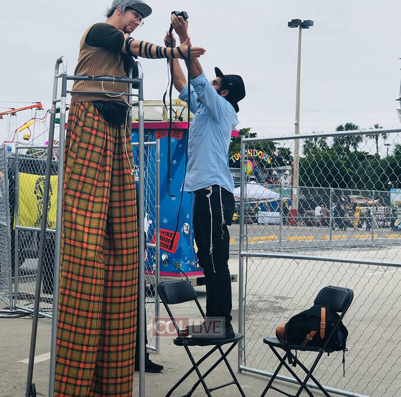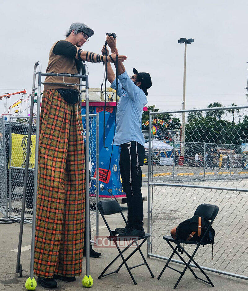 Lubavitcher Menachem Mendel Levy helps a Jewish stilt artist put on Tefillin at the Broward County Fair in South Florida, Sunday. Photos