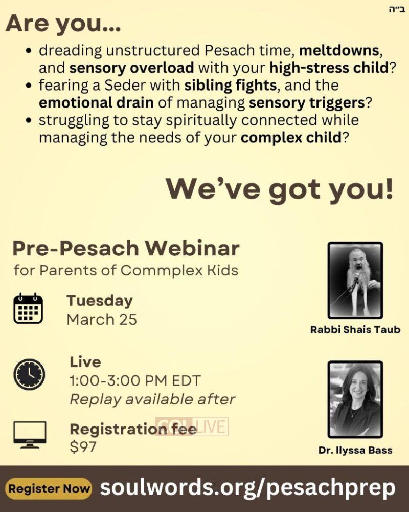 To help navigate these difficulties, Rabbi Shais Taub and Dr. Ilyssa Bass are offering a Pre-Pesach Prep Webinar on Tuesday, March 25, from 1:00-3:00 PM EDT. This two-hour session will provide practical strategies and spiritual guidance to help parents manage their child’s sensory needs, emotional regulation, and family dynamics during Pesach.