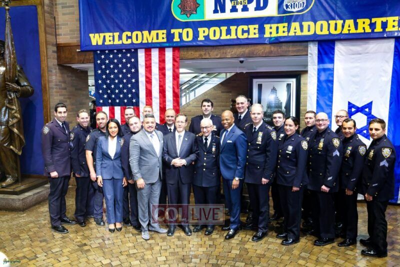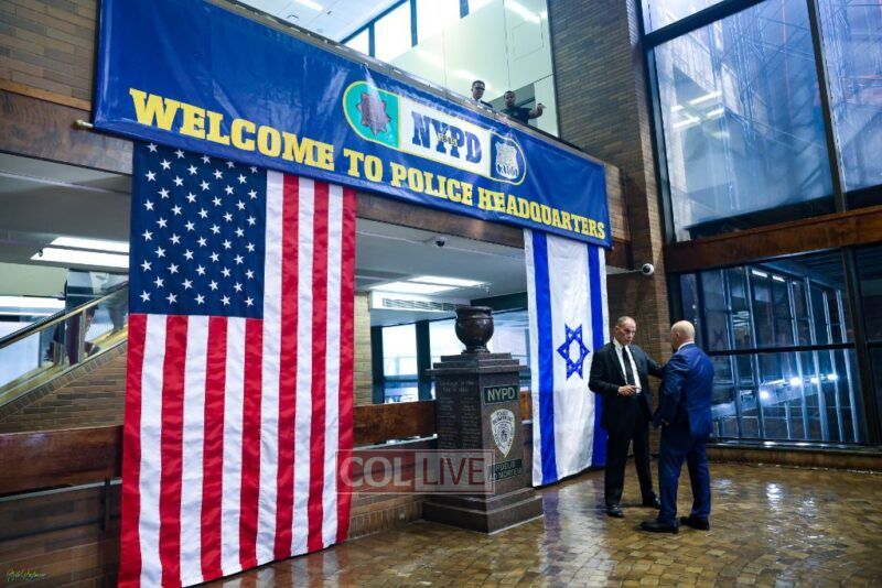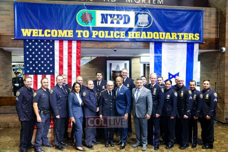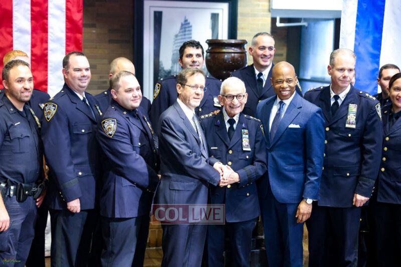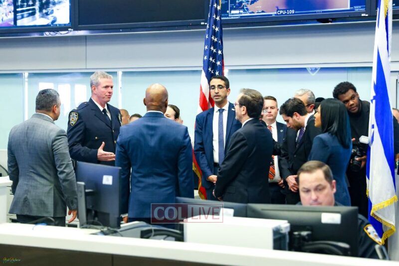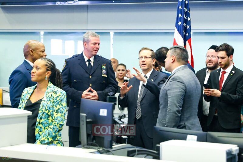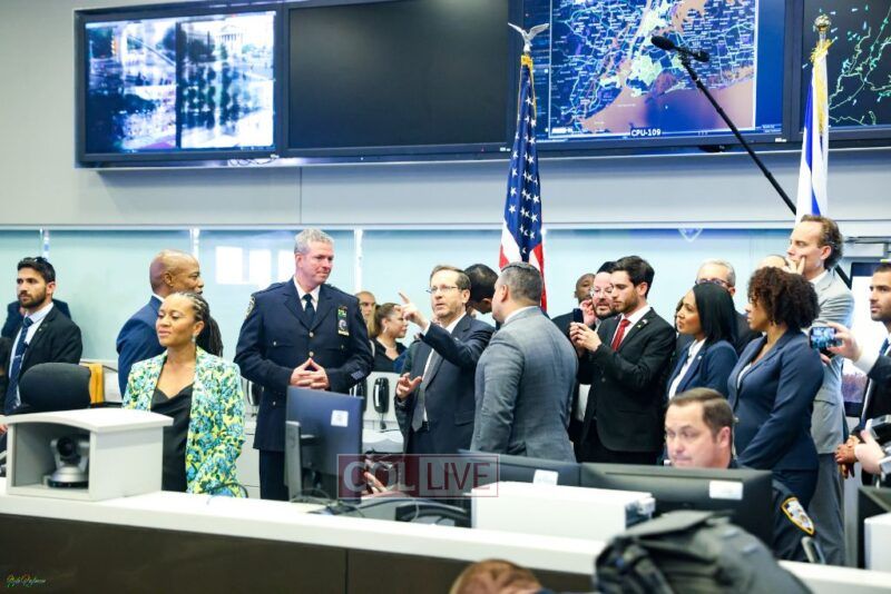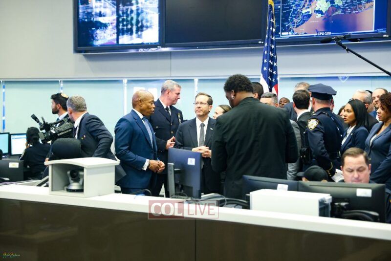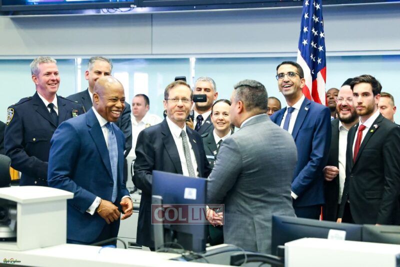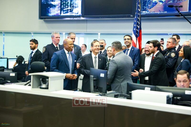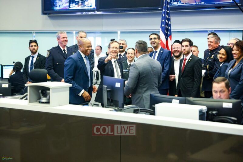 Mayor Eric Adams and NYPD Commissioner Edward Caban met with President Herzog at police headquarters on Thursday. Adams spoke briefly to reporters after the meeting, where he called New York the “Tel Aviv of America.”
