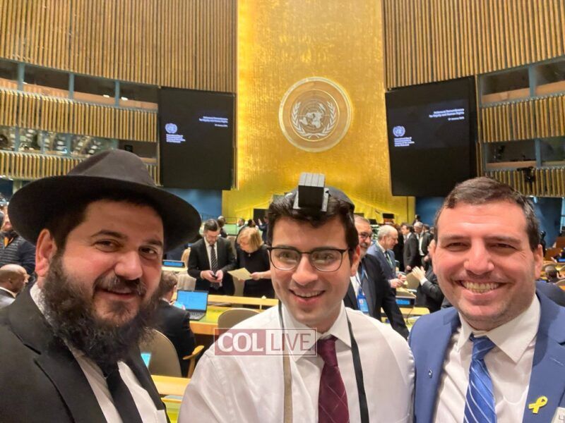 Before the speech, Rabbi Kotlarsky helped people in the Israeli delegation with putting on Tefillin and davening. One of them was Ofir Akunis, Consul General of Israel in New York