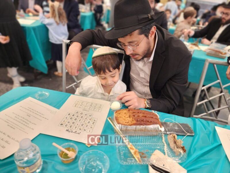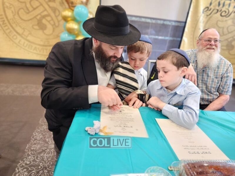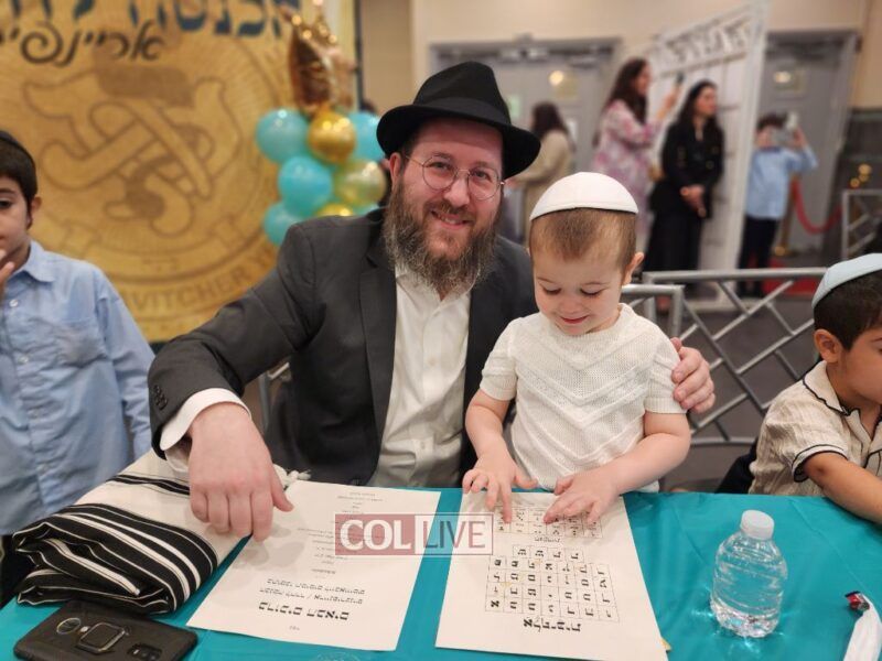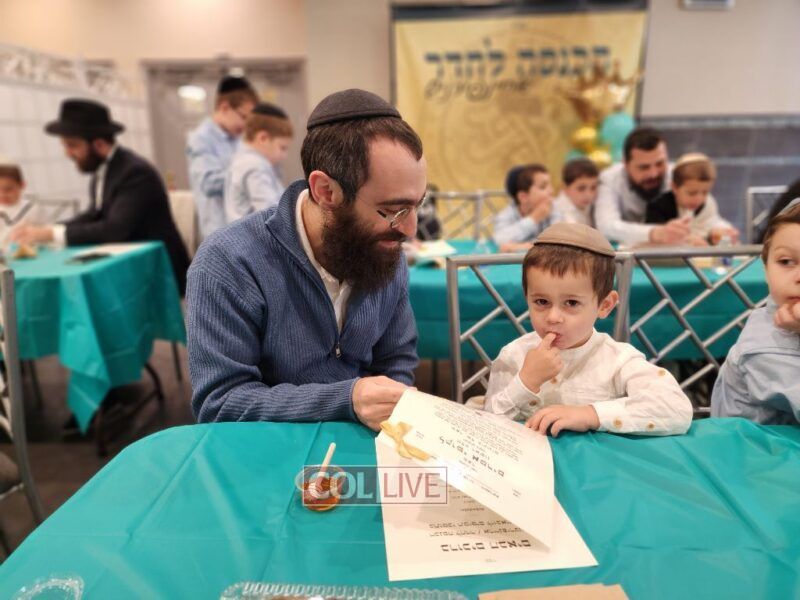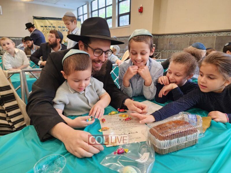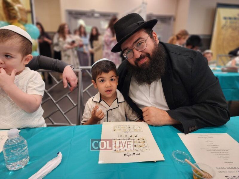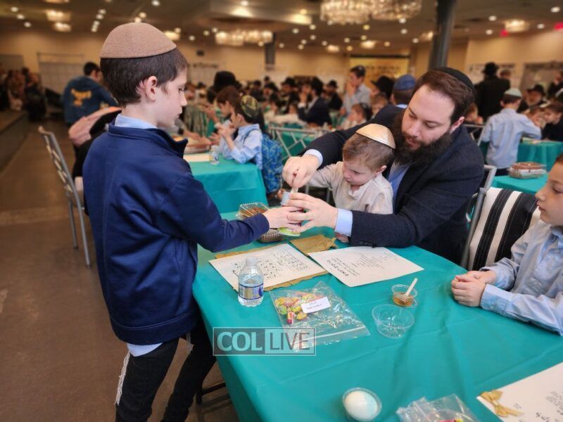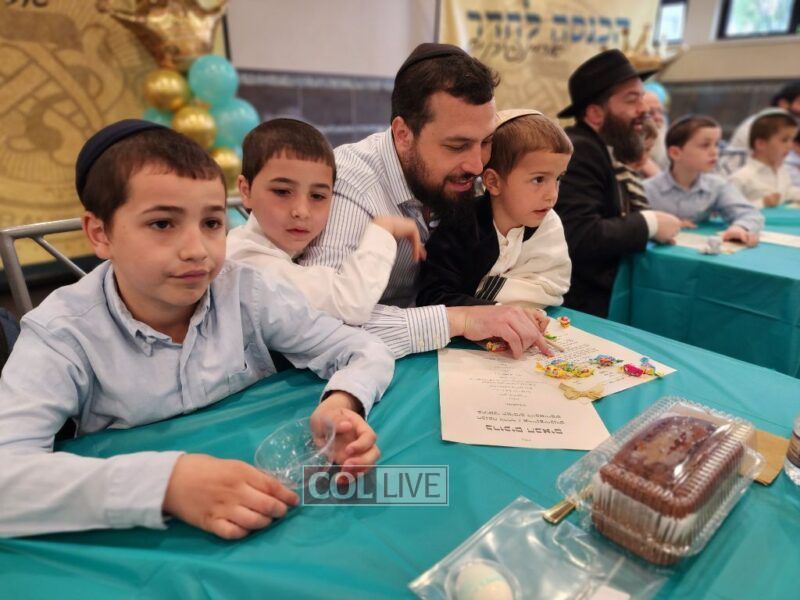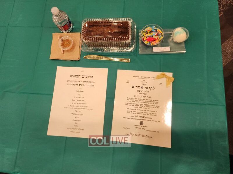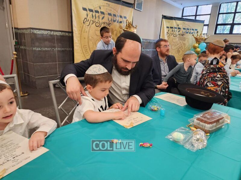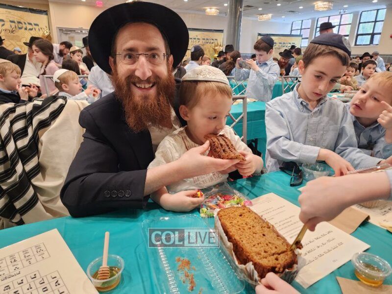 Each child was presented with his own inscribed honey cake, an egg with special pesukim, and the Sha’ar Blatt of Tanya with honey. An interactive slideshow helped the children find each letter of the Aleph Beis in their page of Tanya. The boys licked the honey from the letters, introducing them to the sweetness of Torah. Malach Michoel threw candies, and then each boy got to eat his delicious honey cake and egg.