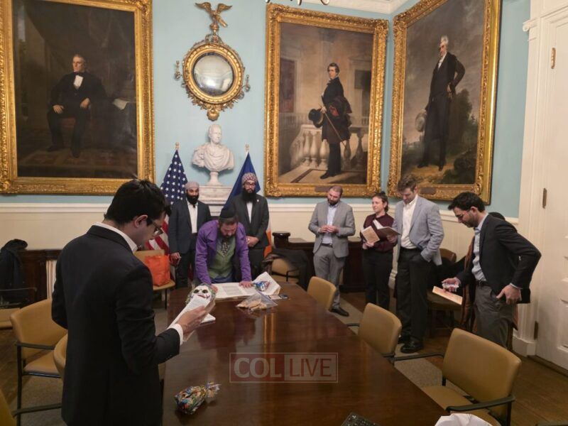 On Tuesday, March 3, 2026, a Megillah reading for staff members was held at New York City Hall, in the Governor’s Room. Many City Hall employees attended the gathering to observe the Purim Mitzvah of hearing the Megillah.