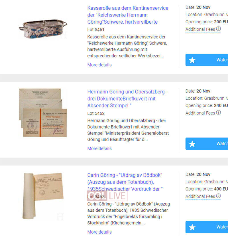 Hermann Historica will be holding an auction on the 20th November that includes a number of pieces for sale from the Nazi leadership including framed photographs, silver dinner services, plates, letters and Jewellery belonging to Goring’s wife.