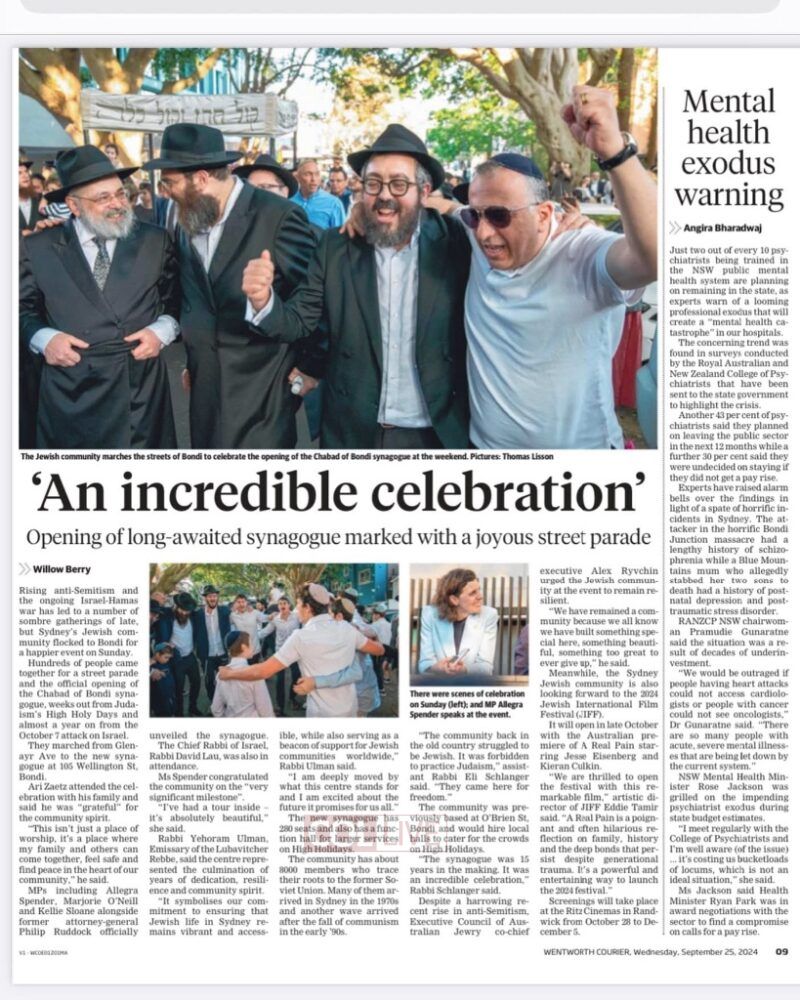 On Sunday, Rabbi Schlanger was part of the organizing team of annual Chanukah by the Sea in the Bondi Beach Park. The event features a lighting ceremony of a large Menorah followed by a celebration for the community.