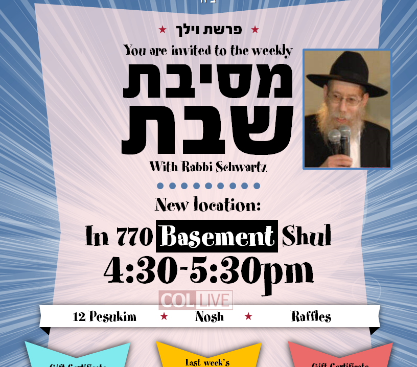 The Mesibos Shabbos will take place at 770 Shul, in the basement, and will be led by Rabbi Moshe Schwartz, longtime partner in its organization.