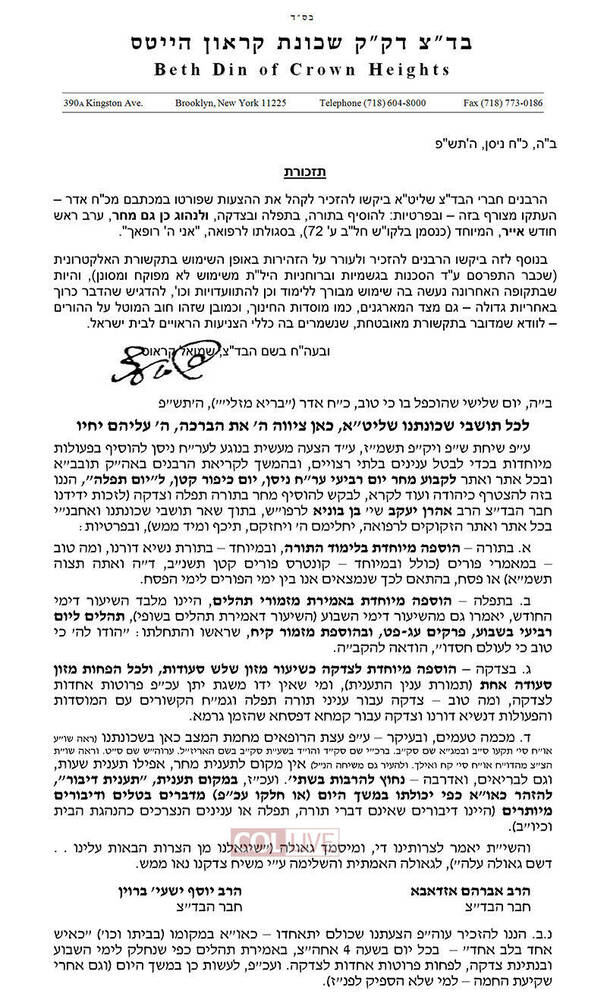 In a letter to the community, the Beis Din of Crown Heights has called for tomorrow, Erev Rosh Chodesh Iyar, to be a day of increased Torah Tefillah and Tzedakah.