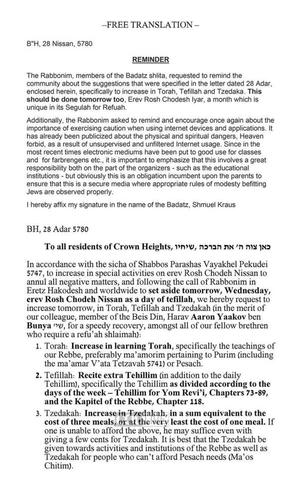 In accordance with the sicha of Shabbos Parashas Vayakhel Pekudei 5747, to increase in special activities on erev Rosh Chodeh Nissan to annul all negative matters, and following the call of Rabbonim in Eretz Hakodesh and worldwide to set aside tomorrow, Wednesday, erev Rosh Chodesh Nissan as a day of tefillah, we hereby request to increase tomorrow, in Torah, Tefillah and Tzedakah (in the merit of