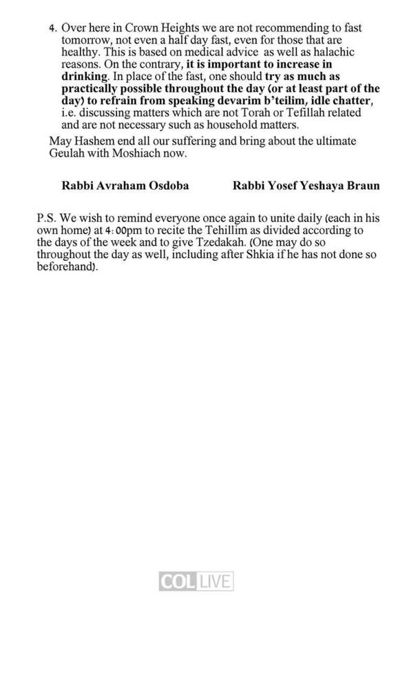4. Over here in Crown Heights we are not recommending to fast tomorrow, not even a half day fast, even for those that are healthy. This is based on medical advice as well as halachic reasons. On the contrary, it is important to increase in drinking. In place of the fast, one should try as much as practically possible throughout the day (or at least part of the day) to refrain from speaking devarim b’teilim, idle chatter, i.e. discussing matters which are not Torah or Tefillah related and are not necessary such as household matters.