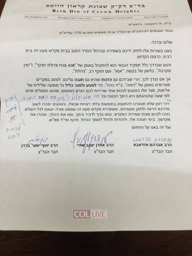 The Crown Heights Badatz have issued a letter Monday, encouraging the 770 Gabboim to enforce order in 770 Eastern Parkway.