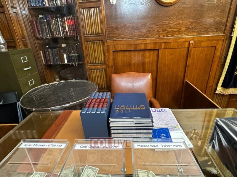 The set was brought to the Rebbe’s Ohel and subsequently placed on the Rebbe’s Desk in the Rebbe’s room in 770.