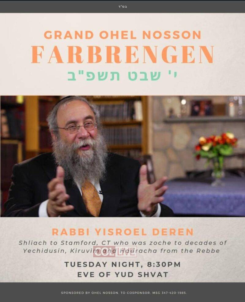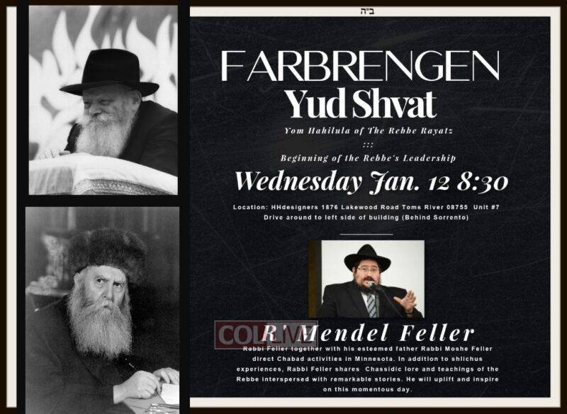 Farbrengen Wednesday night at 9:30 pm with Rabbi Leima Wilhelm.