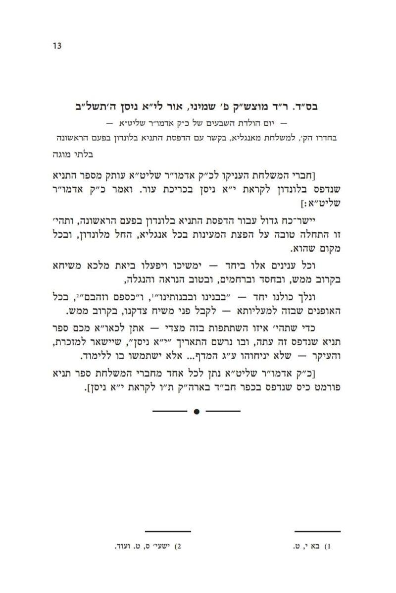 According to the yomanim from that year, Rabbi Nachman Sudak, the Rebbe’s Shliach to England, waited in Gan Eden Hatachton that Friday (9 Nissan) to gift the Rebbe a copy of the Tanya that was printed especially in England, as a tribute to the Rebbe and in line with his request to print the Tanya in every location.