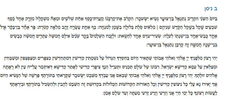 Every day through Nissan 13, we recite the verses describing the offerings made by the nesi'im ('princes') of the 12 tribes of Israel. It follows with a short prayer. Nasi