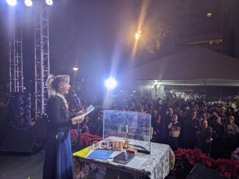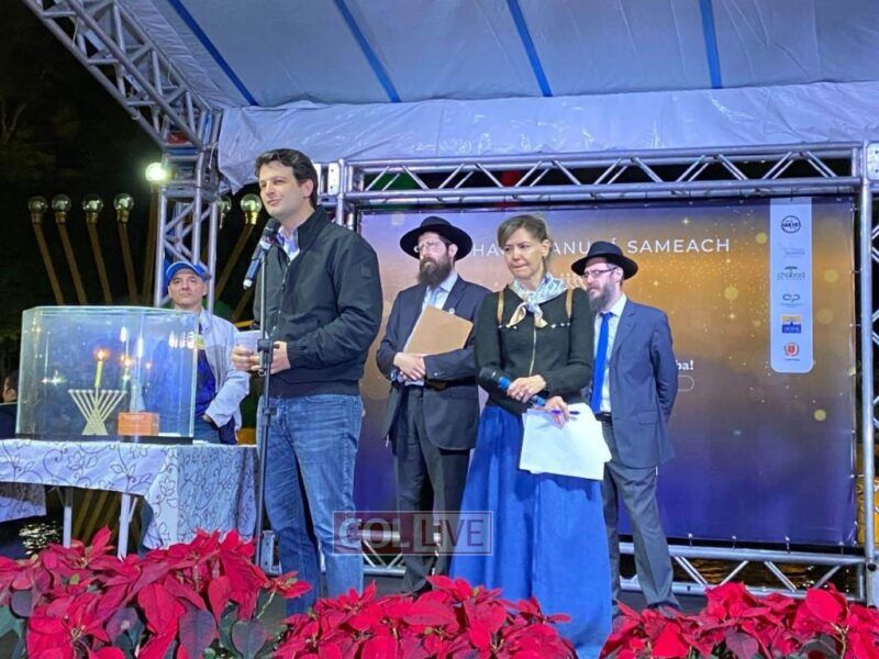 The public Menorah lighting in Curitiba attracts hundreds of community members who enjoy diverse activities and delicious latkes and doughnuts with cold drinks each year. With this year being a Hakhel year, special effort was invested to invite representatives of all jewish entities in the general kehila to be part of the program in a very special way. Each member was invited to present one of the Rebbe’s hand picked 12 Torah passages and to call upon a community child to recite it. The city hall provides a beautiful platform, banners, tents and sound yearly besides erecting the Menorah in the square’s pond and taking it down and storing it from year to year. The superintendent of the federal Police and the vice Mayor were also present in this year’s program.