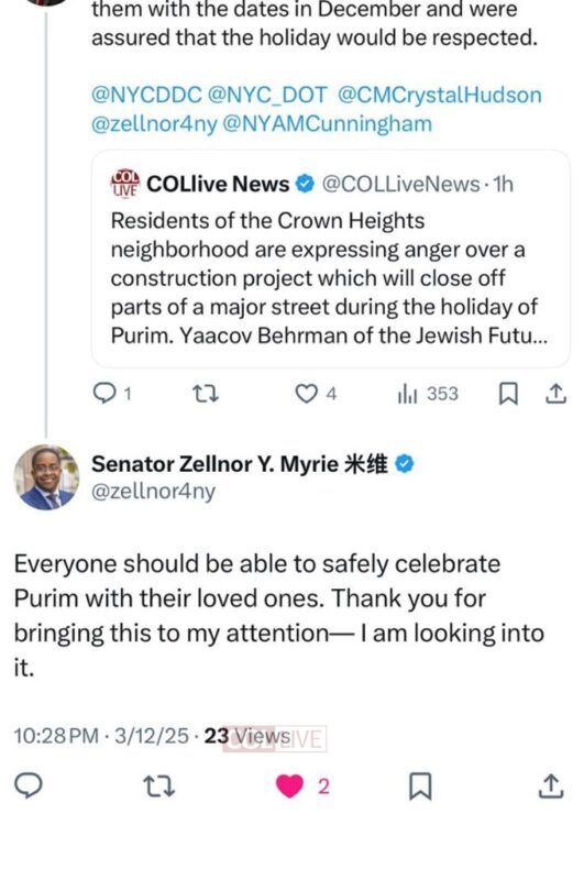 Behrman said he has sent multiple requests to cancel, however “the DDC and contractor refuse to cancel construction on Purim, posing a direct safety risk to the community.”
