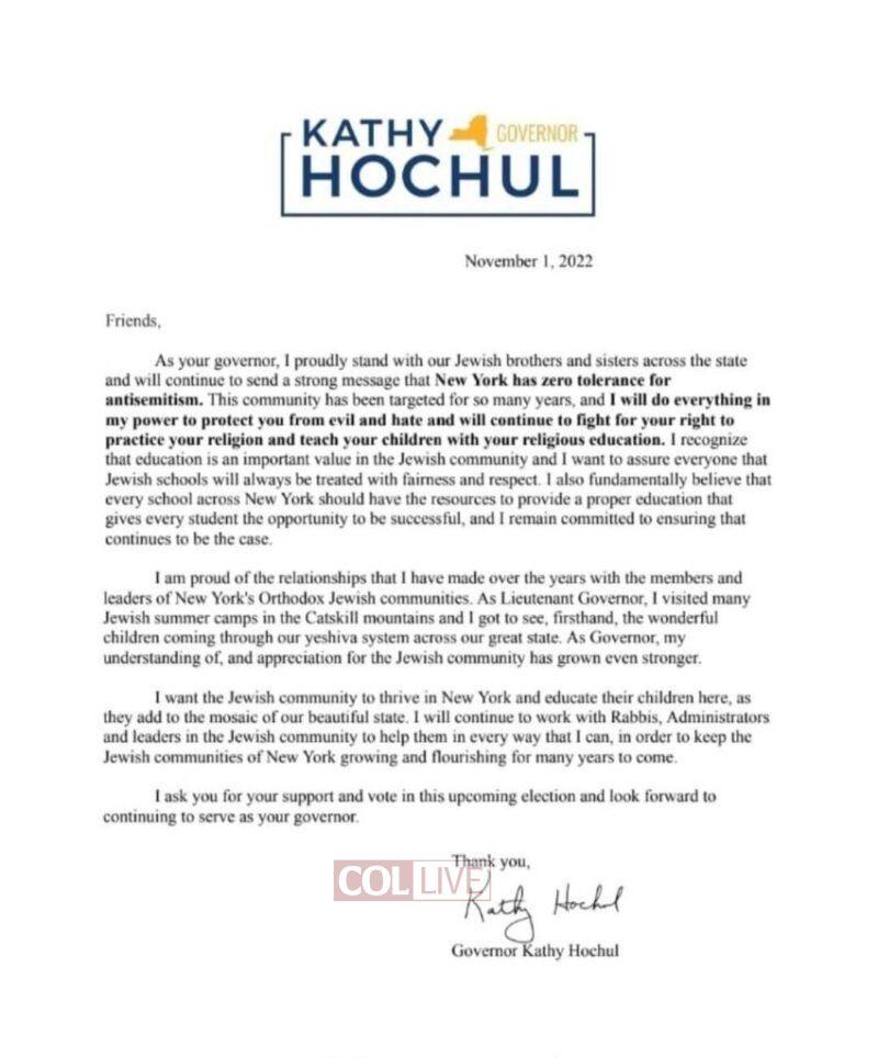 In a letter Hochul released to the Orthodox Jewish community on November 1st, she pledged to do everything in her power to protect the community from the evil and hatred of antisemitism and to fight for yeshivas.