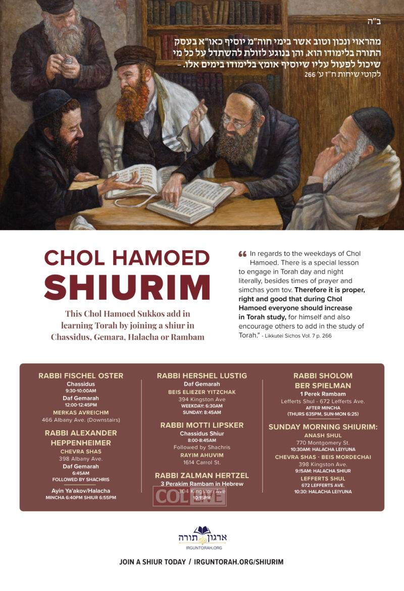 Join Irgun Torah this Chol Hamoed for exciting shiurim with great magidei shiurim, and add in learning Torah by joining a shiur in Chassidus, Gemara, Halacha or Rambam: