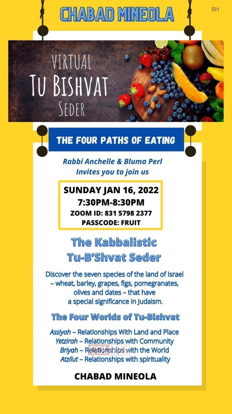 This is how Chabad Mineola in New York began its Virtual Tu Bishvat Kabbalistic Seder. More than 100 people joined this uplifting online experience. It was hosted by Shliach Rabbi Anchelle Perl.