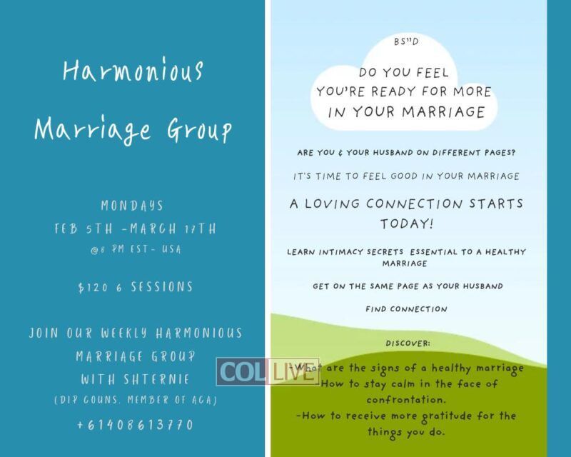 Shternie is now offering a 6 week course on Harmonious Marriage, via group sessions on Zoom. The sessions will help you discover the signs of a healthy marriage, calm during confrontation and how to receive more gratitude for the things you do.