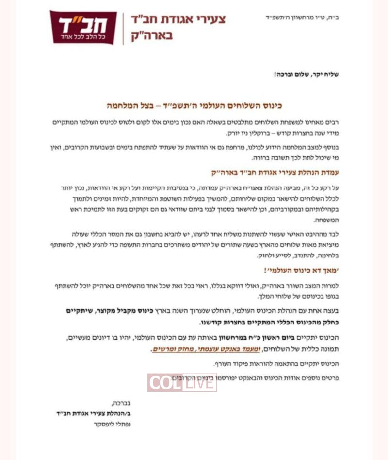 “It is more correct for all Shluchim to remain in their Shlichus location, to continue in their ongoing and unique operations and be available and supportive of their communities and members, as well as remain close to their families,” wrote Rabbi Naftali Lipsker of Tzach.