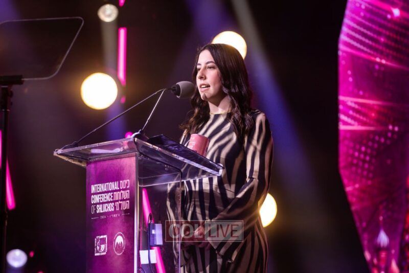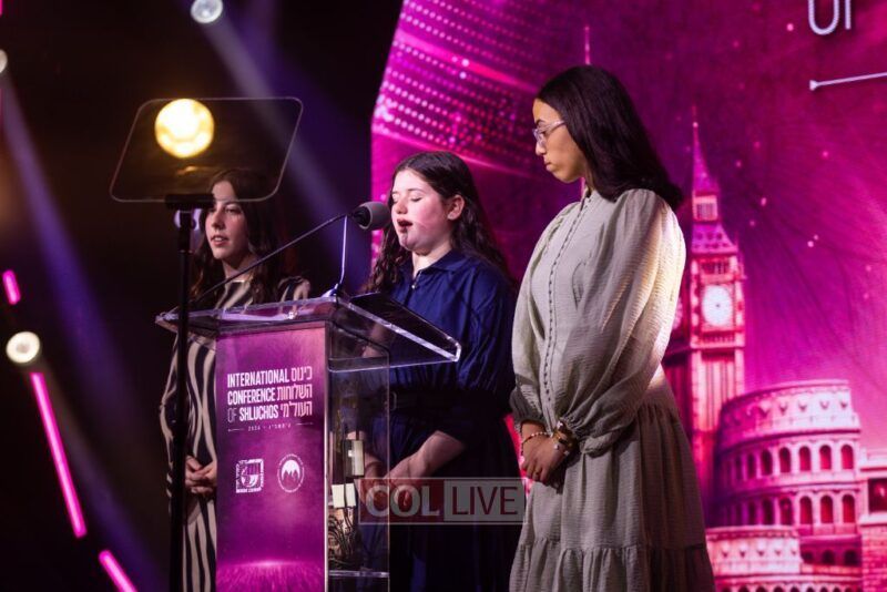 The evening’s most powerful moment came when three young women from Sydney, Australia, took the stage. Priva Schlanger and Mina Levitan, daughters of Rabbi Eli Schlanger HY”D and Rabbi Yaakov Levitan HY”D who were murdered in the Bondi Beach terror attack on Chanukah, stood alongside Chaya Dadon, 14, who was shot while shielding two young children during the massacre.